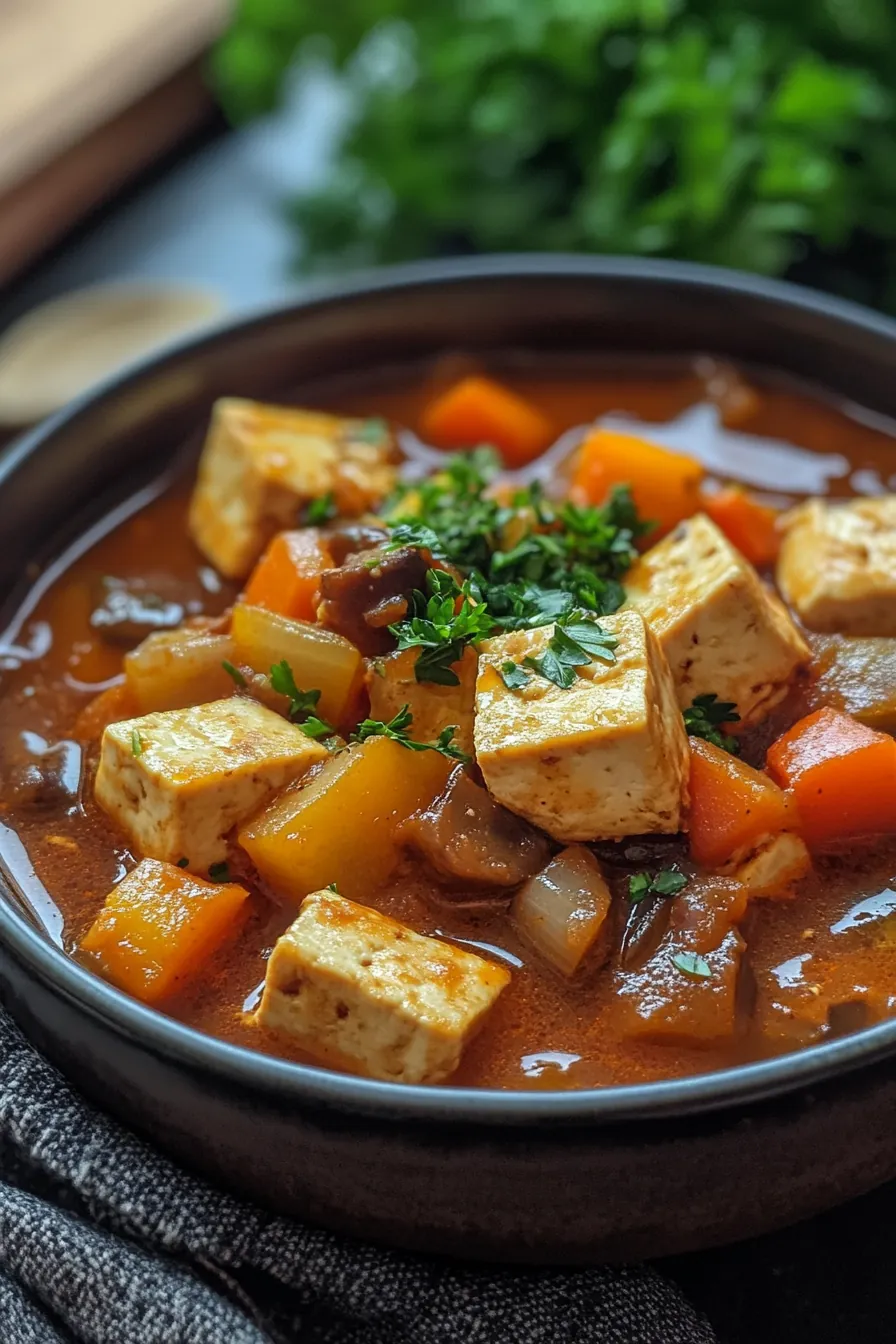 This delightful slow cooker tofu stew captures the essence of seasonal vegetables in a comforting, hearty dish.